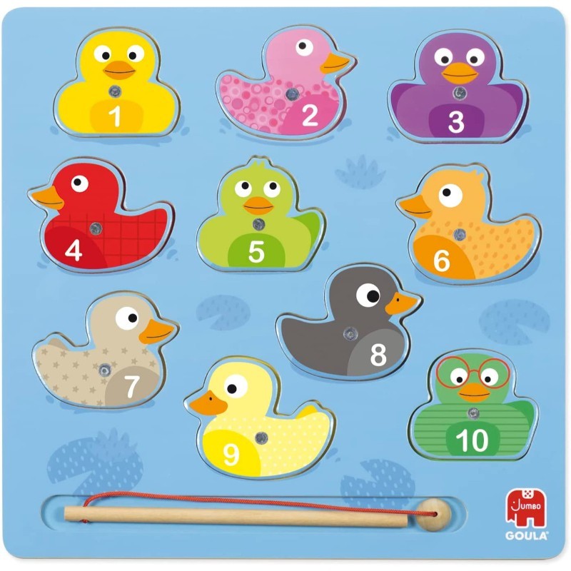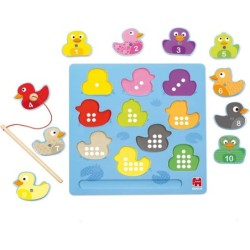 Puzle de madera y magnético de 28 x 28cm con 11 piezas (10 patos y una caña de pescar) recomendado para niños a partir de 2 años.