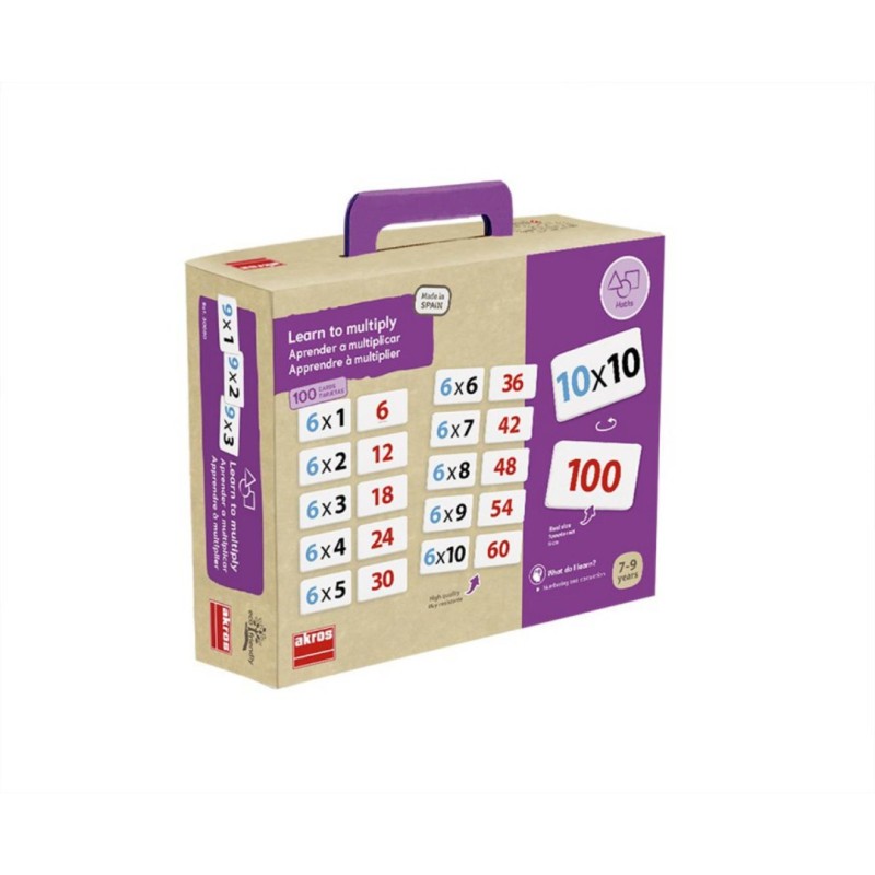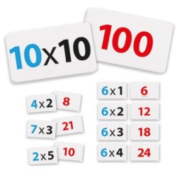 100 fichas a dos caras, por un lado con el multiplicando en azul y el multiplicador en negro, y por el otro lado el resultado en rojo. La diferenciación de colores en el multiplicando permite la agrupación de fichas para trabajar las tablas de multiplicar