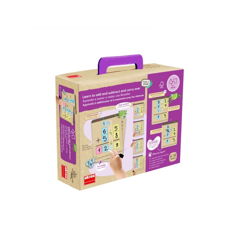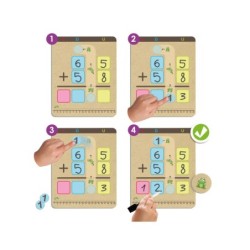 Aprende a sumar y restar con llevadas mediante un sencillo método para entender el paso entre las unidades y las decenas. Los 8 tableros son reescribibles para practicar tantas veces como quieras, y en la base incluyen una recta numérica para facilitar el cálculo. Contiene dos sistemas para realizar la resta con llevadas por compensación y por agrupamiento. Incluye una tabla para trabajar los dobles del 1 al 10 y la descomposición del número 10. ¡Ahora sumar y restar es fácil y divertido!