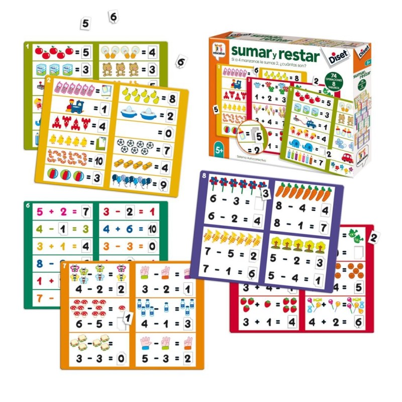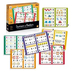 Juego educativo para aprender las primera operaciones matemáticas:sumas y restas con 9 tableros y 74 fichas autocorrectivas.