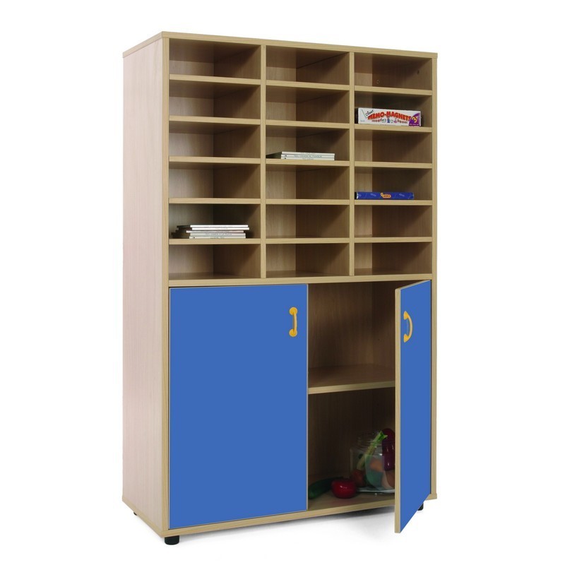 Mueble armario 4 casillas (abajo) y casillero con 18 casillas en su parte superior, fabricado en melamina de haya de 19 mm de grosor, excepto trasera de 10 mm, puertas de 16 mm y cantos de PVC de 2 mm, acabado por las dos caras. Pies niveladores de PVC de 4 cm de diámetro y 4 cm de altura, para evitar la humedad y desniveles que pueda tener el suelo. Estos pies pueden ser retirados para poder superponer diferentes armarios. PUERTAS INTERIORES ANTIATRAPAMIENTO DE DEDOS EN SU CIERRE y tiradores de polímero suave (goma) (antigolpes).