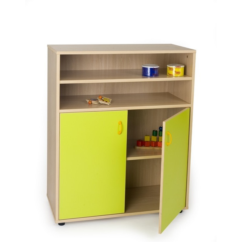 Mueble armario y estantería 2 estantes fabricado en melamina de haya de 19 mm de grosor, excepto trasera de 10 mm, puertas de 16 mm y cantos de PVC de 2 mm, acabado por las dos caras. Pies niveladores de PVC de 4 cm de diámetro y 4 cm de altura, para evitar la humedad y desniveles que pueda tener el suelo. Estos pies pueden ser retirados para poder superponer diferentes armarios. PUERTAS INTERIORES ANTIATRAPAMIENTO DE DEDOS EN SUCIERRE y tiradores de polímero suave (goma) (antigolpes).