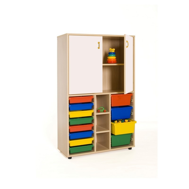 Mueble cubetero ( absajo ) y armario 2 estantes en su parte superior, fabricado en melamina de haya de 19 mm de grosor, excepto trasera de 10 mm, puertas de 16 mm y cantos de PVC de 2 mm, acabado por las dos caras. Pies niveladores de PVC de 4 cm de diámetro y 4 cm de altura, para evitar la humedad y desniveles que pueda tener el suelo. Estos pies pueden ser retirados para poder superponer diferentes armarios. PUERTAS INTERIORES ANTIATRAPAMIENTO DE DEDOS EN SU CIERRE y tiradores de polímero suave (goma) (antigolpes).