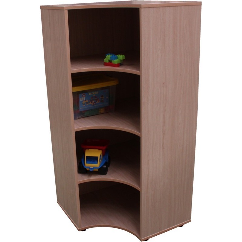 Mueble esquinero abierto 4 estantes fabricado en melamina de haya de 19 mm de grosor, excepto trasera de 10 mm y cantos de PVC de 2 mm, acabado por las dos caras. Pies niveladores de PVC de 4 cm de diámetro y 4 cm de altura, para evitar la humedad y desniveles que pueda tener el suelo. Estos pies pueden ser retirados para poder superponer diferentes armarios.