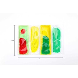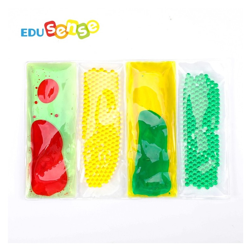 Panel rellenado de gel de diferentes colores. Con distinto tactos: bolitas y líquido, producen una sensación muy agradable y estimulan el desarrollo sensorial y perceptual.
