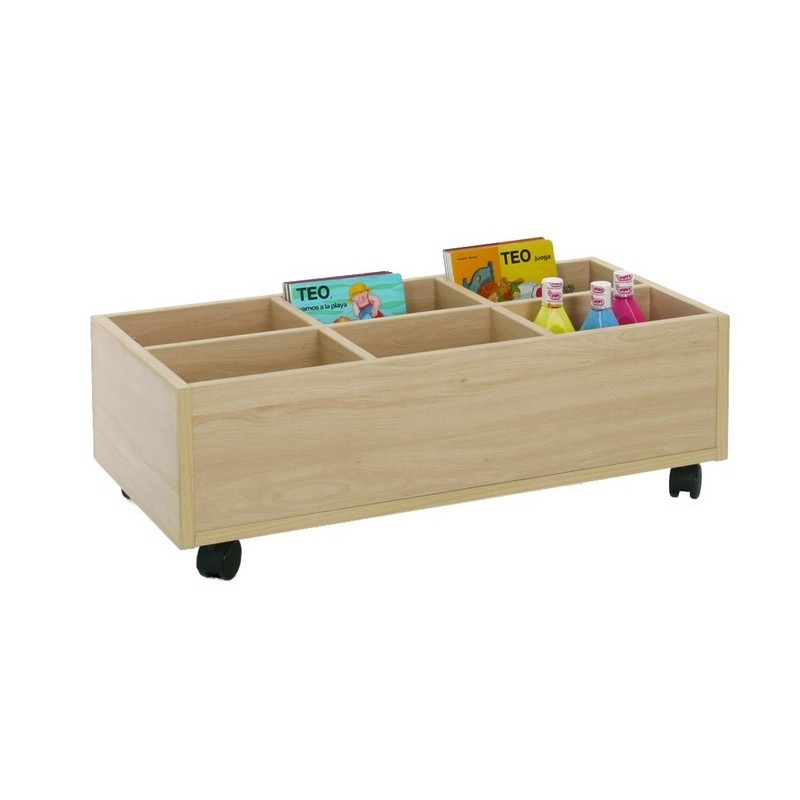 Mueble librería compuesto de 6 casillas de almacenamiento. Fabricado en melamina de haya, con tableros de 19 mm de espesor; separadores de 16 mm y cantos de PVC de 2 mm, acabado por las dos caras. Ruedas de 6 cm con freno, para evitar la humedad y poder desplazarlo fácilmente.