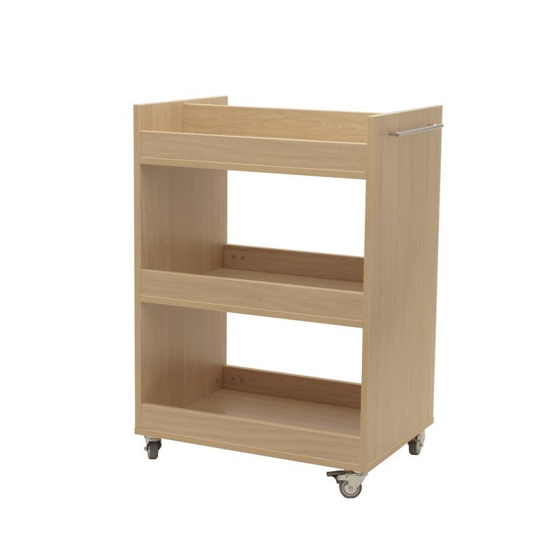 Carro librería compuesto por 3 baldas con frentes, para el almacenamiento y transporte de libros. Balda superior dividida por la mitad. Accesible por las dos caras. Fabricado en melamina de haya con tableros de 19 mm de espesor y cantos de PVC de 2 mm acabados por las dos caras. Ruedas de 8 cm. con doble freno y soporte metálico para alta carga y uso continuado.