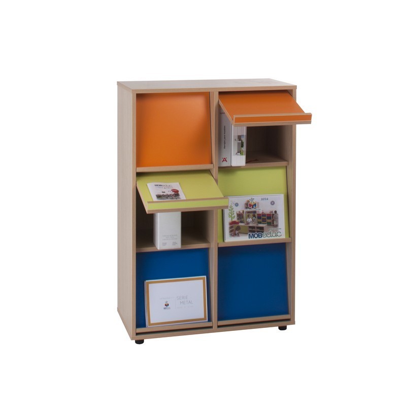 Armario expositor, compuesto de seis casillas a tres niveles de altura y puertas batientes con balda para exponer libros de frente. Fabricado en melamina de haya con tableros de 19 mm de espesor, excepto trasera de 10 mm. Cantos de PVC de 2 mm acabados por las dos caras. Pies niveladores de PVC de 4 cm de diámetro y 4 cm de altura, para evitar la humedad y posibles desniveles del suelo. Estos pies pueden ser sustituidos por ruedas, o bien ser retirados para poder superponer diferentes armarios.