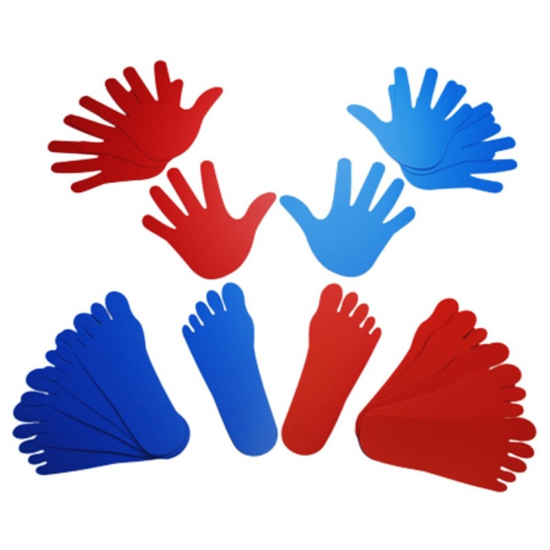 Un conjunto de manos y pies realizados en plástico rojo y azul, para indicar izquierda y derecha para su utilización en circuitos de psicomotricidad y y juegos de lateralidad.