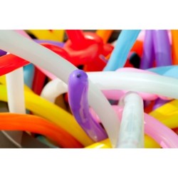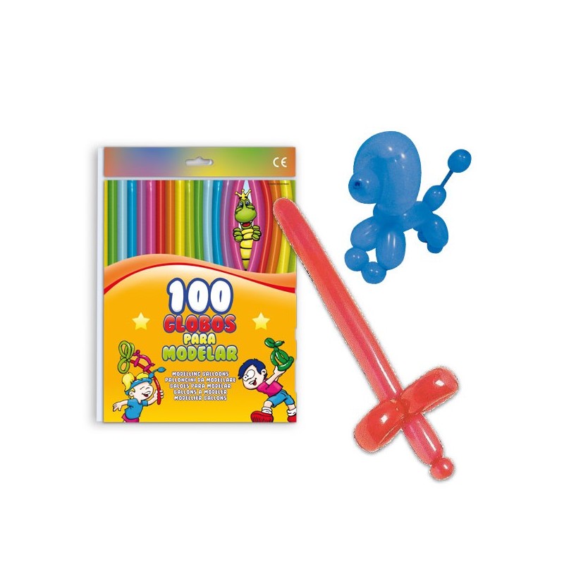 Bolsa con 100 globos de colores surtidos, para realizar diferentes figuras. Fabricados en latex de caucho natural, y totalmente biodegradable.