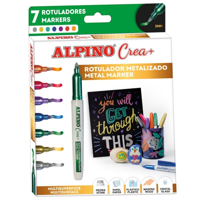 7 Rotuladores de colores metalizados base agua, para decorar todo tipo de superficies: cartulina, madera, cristal, plástico, piedra, metal… Dispone de 5 colores vivos y brillantes. Resultados sorprendentes sobre superficies oscuras. Es el material para manulidades perfecto para niños y adultos para decorar diferentes tipos de superficie.