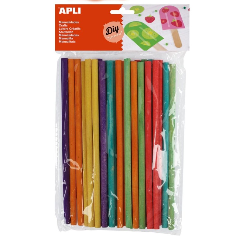 Palos redondos de madera tamaño 150 x 5 mm en colores surtidos: verde, azul, naranja, lila, rojo y amarillo. Cada bolsa contiene 25 palos. Palos redondos de gran resistencia, fáciles de pegar, pintar e incluso cortar. Producto básico para escuelas y talleres infantiles, ideales para crear decoraciones, construcción de estructuras, maquetas o usar en otras manualidades. Ideales para estimular la imaginación y creatividad de los niños.