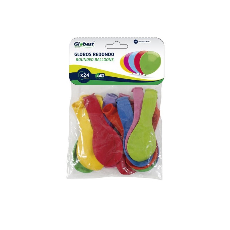 Bolsa de 24 globos redondos de 24 cm de diámetro de látex. Colores surtidos.