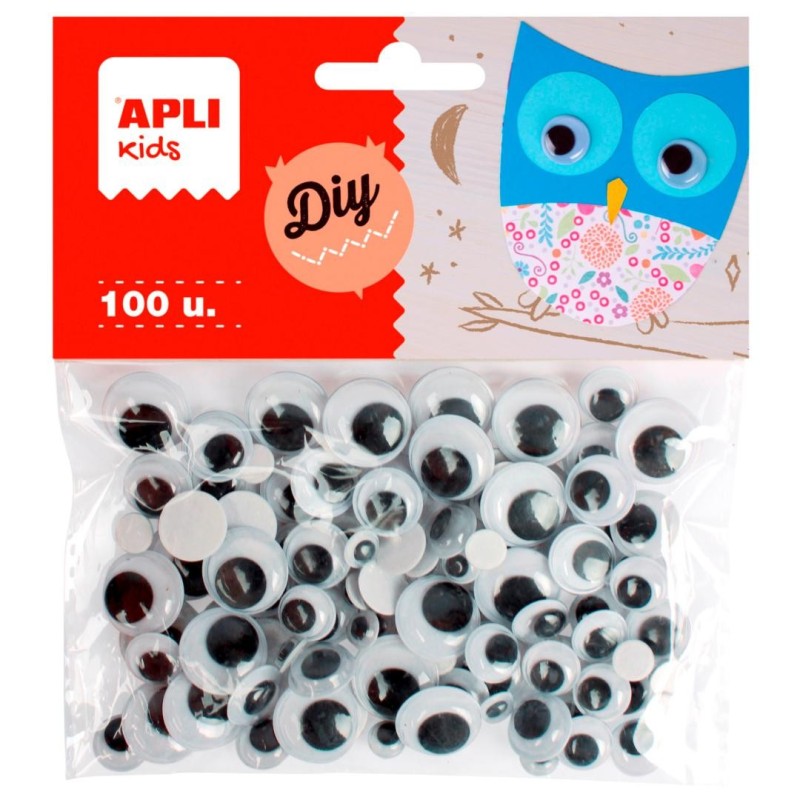 Ojos móviles adhesivos redondos de color negro. Medidas surtidas*: Ø 7 mm, Ø 10 mm, Ø 12 mm y Ø 15 mm. Cada bolsa contiene 100 ojos. Ojos con adhesivo en el dorso, listos para usar. Gran poder de adhesión sobre multitud de superficies: papel, cartón, goma EVA, plástico, cerámica o cristal. Producto básico para escuelas y talleres infantiles, ideales para añadir a dibujos, marionetas o usar en otras manualidades.