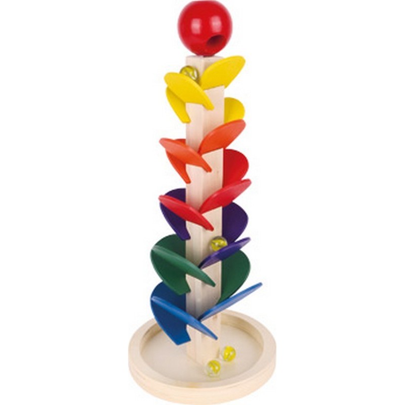 Observe y escuche: ¡esta pista de canicas es una verdadera experiencia sonora! En cuanto se introduce una canica de vidrio en la parte superior de la bola de madera, se pasa de los tonos claros a los más oscuros en la zona inferior de las hojas de este árbol sonoro. Además: los colores frescos y típicos del arcoíris hacen de esta pista una atracción decorativa en la habitación infantil.
