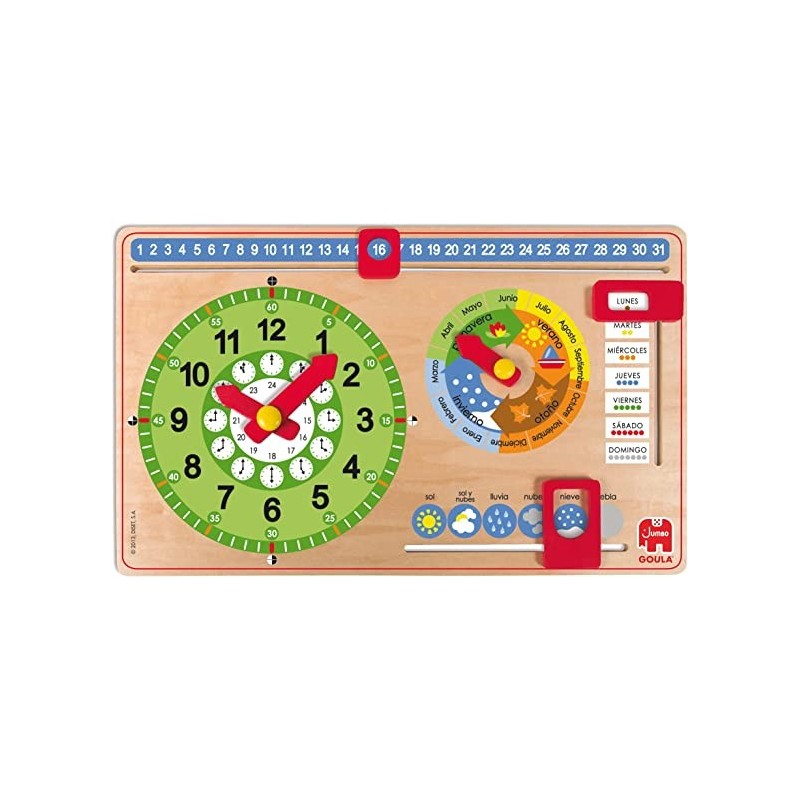 - Juguete muy educativo en el que se inicia al aprendizaje de los meses, las estaciones, el tiempo, los días, las horas y los minutos