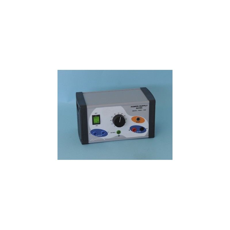 La fuente de alimentación AC/DC permite suministrar un voltaje entre 1 y 12 V en pasos de 1 V, seleccionable mediante un mando giratorio en el panel frontal del equipo.
