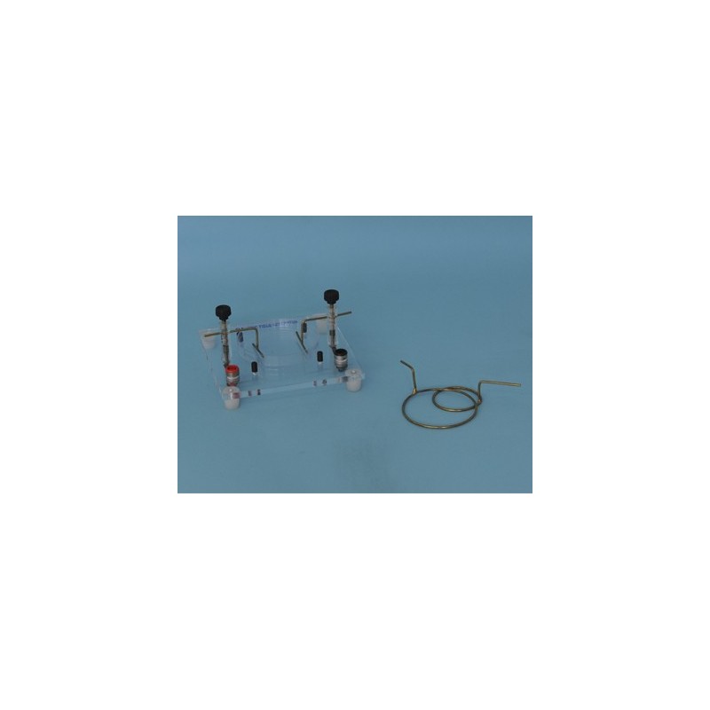 El aparato consiste en una base rectangular transparente equipada con dos clavijas para conectores banana de 4 mm que pueden sujetar distintos electrodos y se suministra completo con una placa circular de plástico transparente, 2 electrodos circulares (uno de 35 y otro de 75 mm), 2 electrodos rectos y 2 electrodos con forma de T.