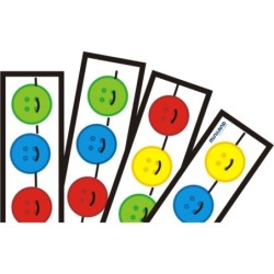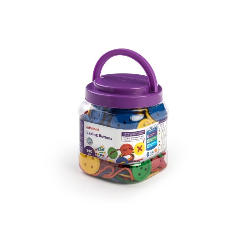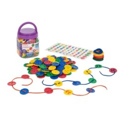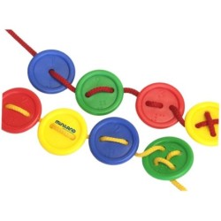 Juego de ensartar, con grandes botones de 1 a 5 agujeros y en vivos colores. Para seriación y clasificación.