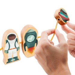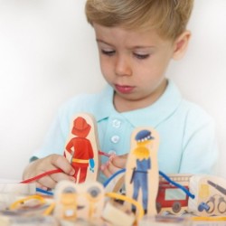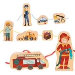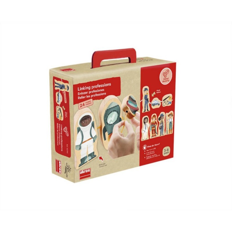 Set de 24 figuras de madera para enlazarlas entre sí, representando diferentes oficios y sus elementos relacionados. Permite al niño enlazar cada oficio con sus elementos y jugar con las figuras, que además se mantienen de pie. Incluye 8 cordones de colores. Desarrolla la psicomotricidad fina en niños a partir de 2 años. Inspirado en la metodología Montessori.