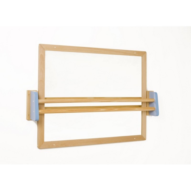 Espejo de visrio con lámina adhesiva de seguridad, garantizando de esta manera que no haya desprendimientos en caso de rotura. Embutido en tablero bilaminado de 19 mm de espesor y cantos en PVC de 2 mm. Sistema robusto de fijación a la pared, mediante pasos de taladrado y atornillado.