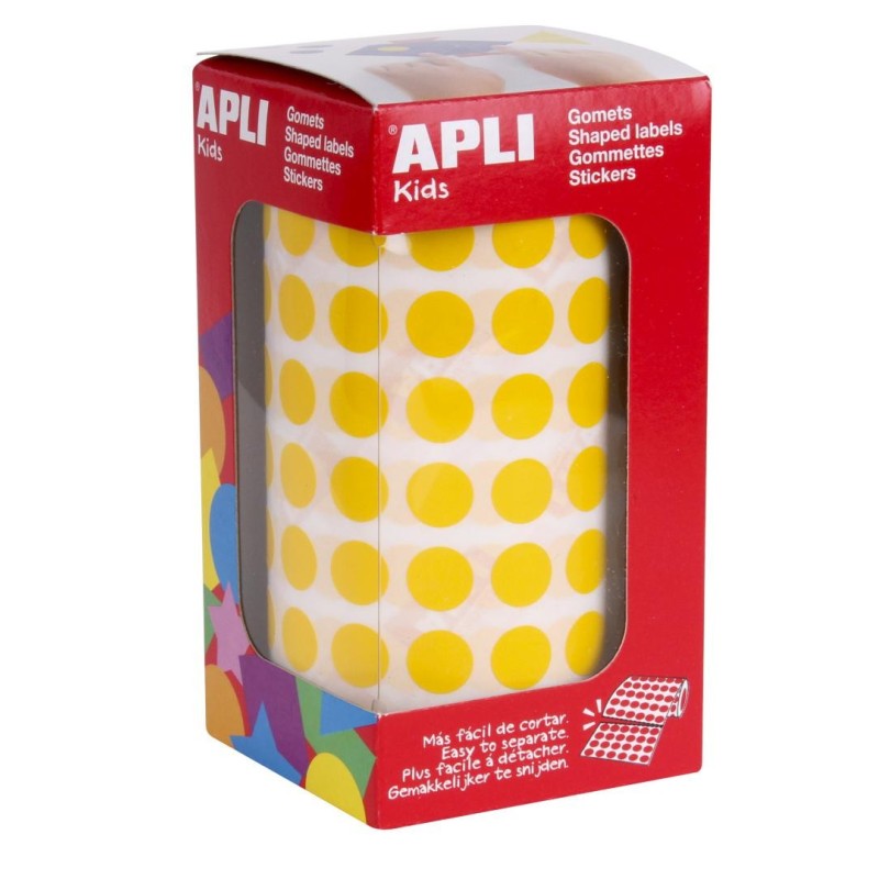 Rollo de gomets redondos de tamaño Ø 10,5 mm en color amarillo con adhesivo permanente. Cada rollo contiene 59 hojas pretroqueladas para una fácil separación, un total de 5.192 gomets por rollo. El formato perfecto para usar en escuelas, guarderías, talleres infantiles o cualquier otro colectivo que trate con niños. Jugar y crear con gomets es una actividad básica que permite desarrollar la psicomotricidad fina y trabajar, al mismo tiempo, varias capacidades y habilidades como el conocimiento de los colores, las formas geométricas y los tamaños; el desarrollo de la lógica y la creatividad; el trabajo en equipo o el dominio del espacio, entre otros. Además, los gomets APLI cumplen con las más estrictas normas de calidad y seguridad: - Se fabrican conforme a las normas EN-71 y a la cadena de custodia FSC - Adhesivo base agua - Libre de disolventes - Papeles ECF (Elemental Chlorine Free) - Materiales 100% reciclables