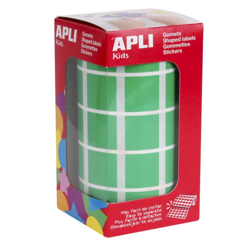 Rollo de gomets cuadrados de tamaño 20 x 20 mm en color verde con adhesivo permanente. Cada rollo contiene 59 hojas pretroqueladas para una fácil separación, un total de 1.770 gomets por rollo. El formato perfecto para usar en escuelas, guarderías, talleres infantiles o cualquier otro colectivo que trate con niños. Jugar y crear con gomets es una actividad básica que permite desarrollar la psicomotricidad fina y trabajar, al mismo tiempo, varias capacidades y habilidades como el conocimiento de los colores, las formas geométricas y los tamaños; el desarrollo de la lógica y la creatividad; el trabajo en equipo o el dominio del espacio, entre otros. Además, los gomets APLI cumplen con las más estrictas normas de calidad y seguridad: - Se fabrican conforme a las normas EN-71 y a la cadena de custodia FSC - Adhesivo base agua - Libre de disolventes - Papeles ECF (Elemental Chlorine Free) - Materiales 100% reciclables