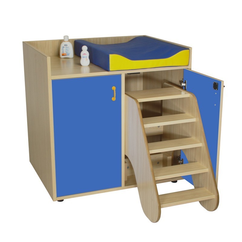 Mueble cambiador con 2 puertas, con balda en el interior de una de las puertas y escalera giratoria (en el interior de la otra), que voltea facilmente, gracias al sistema de giro incorporado, al tirar de ella y vuelve a introducirse cuando se levanta, quedando oculta en el interior del cambiador. Fabricado en melamina de haya de 19 mm de grosor, trasera de 10 mm, puertas en 16 mm y cantos de PVC de 2 mm, acabado por las dos caras. Pies niveladores de 4 cm de diámetro y 4 cm de altura para evitar la humedad y los desniveles que pueda tener el suelo. PUERTAS INTERIORES ANTIATRAPAMIENTO DE DEDOS EN SU CIERRE y tiradores de polímero suave (goma) (antigolpes).