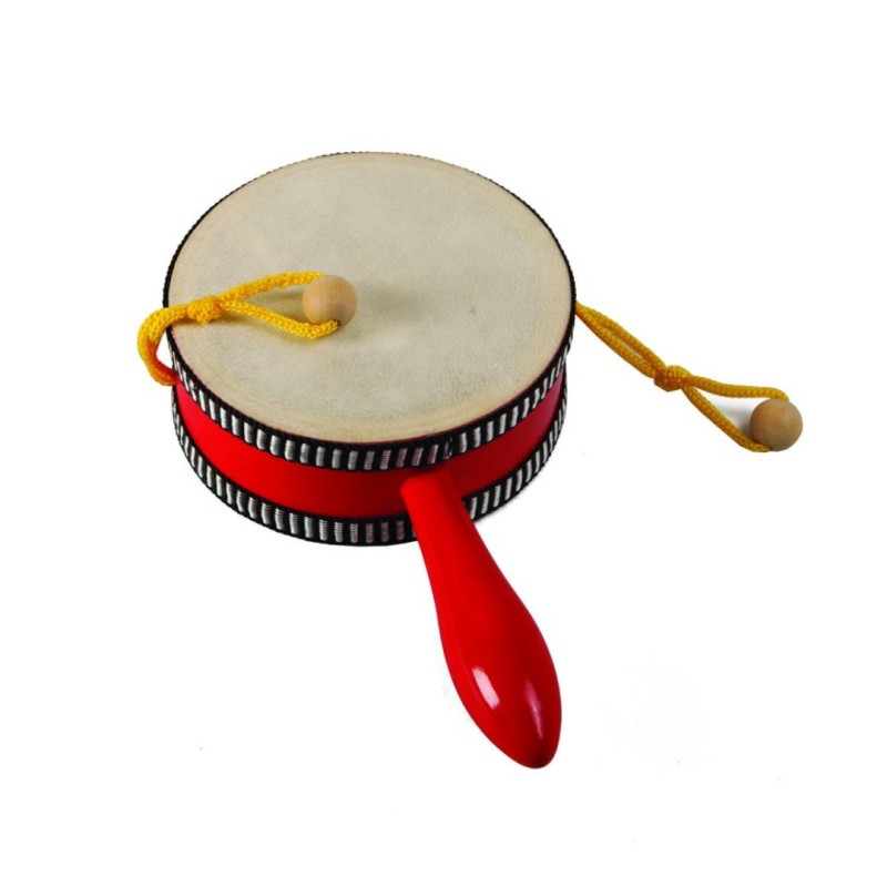 Sigue el ritmo girando este pequeño tambor de mano y haciendo rebotar las cuentas de madera sobre la superficie.