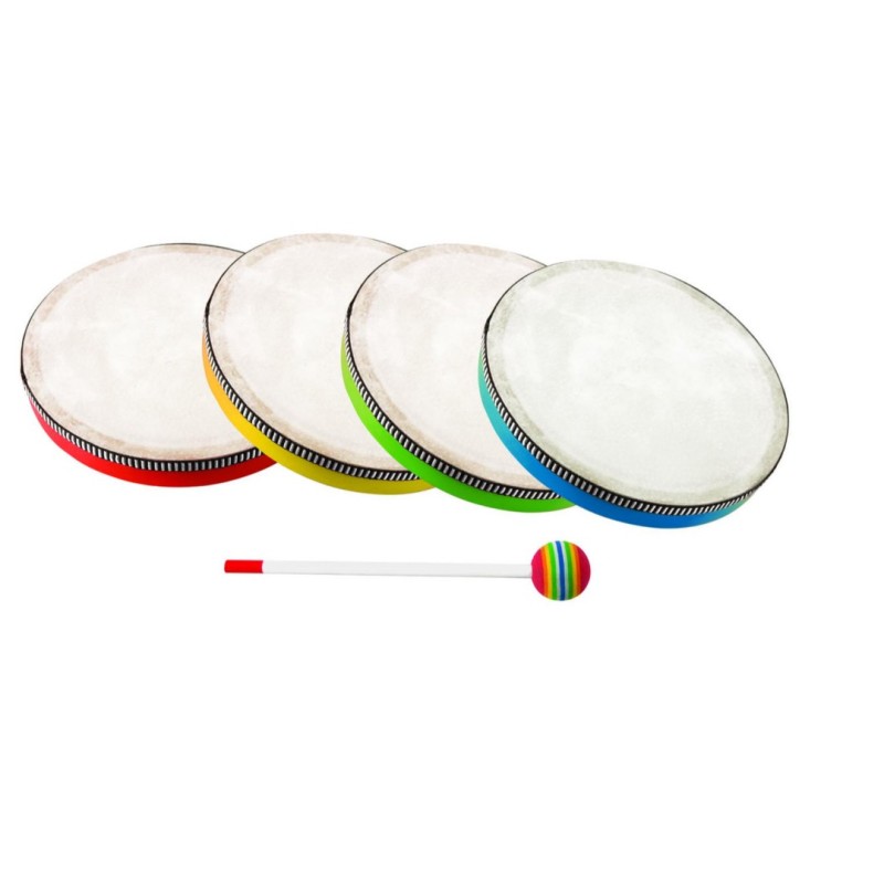 Tambor de mano infantil de colores. 20 cm. Cuerpo de madera. Baqueta de plástico y espuma