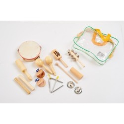 Contiene 2 maracas de madera, 2 de madera castañuelas, una pandereta de madera, un triángulo de metal y un batidor,
