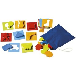 • La caja contiene: 24 figuras de madera de colores, 24 moldes de cartón duro, 1 bolsa de tela y 1 guía didáctica.