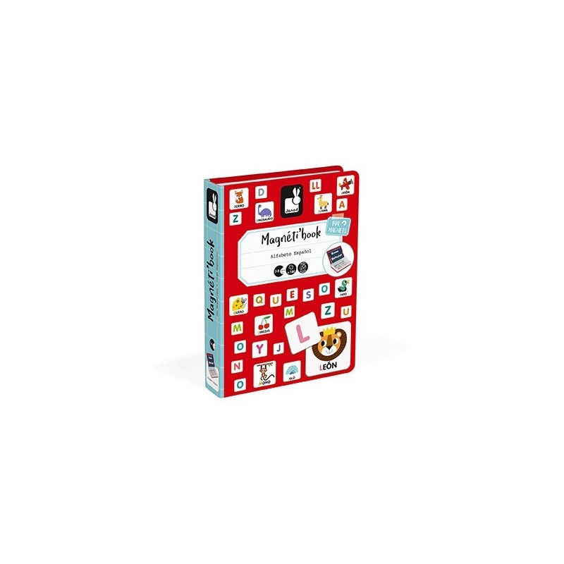 Juego educativo magnético de cartón para aprender el alfabeto en español. Compuesto por 28 imanes con ilustraciones y 116 imanes con letras. Una vez se ha abierto el libro, el objetivo del juego es escribir correctamente en la escena la palabra que indica cada imán con ilustración