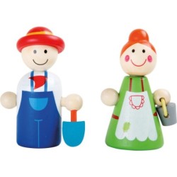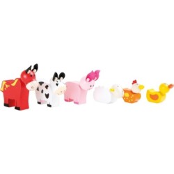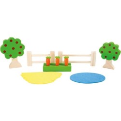 La granja contiene no sólo el granjero y la esposa del granjero, sino también cinco lindos y detallados animales pintados. Vallas, árboles y un lecho de zanahorias para la cosecha completan esta granja de madera.
