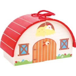 Se incluye 15 piezas lacadas en diferentes colores que entran perfectamente en el granero , el cuál se cierra con una goma elástica para llevarse como si fuese una maleta con sus prácticos cordones.