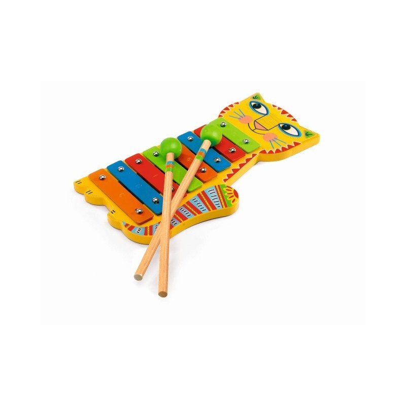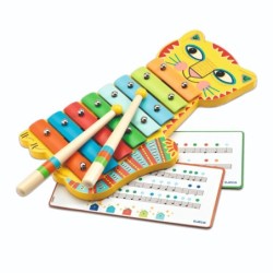Contenido: 1 metalófono con forma de gato (de madera y metal), 2 baquetas (de madera), 2 partituras de doble cara (de cartón).