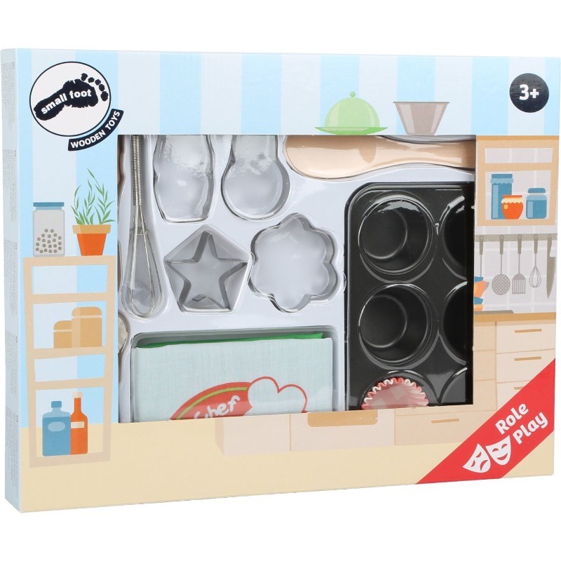 ¡Adecuado especialmente para tener las primeras experiencias con la pastelería! Con las herramientas de madera, tres bandejas para hornear, cortadores de galletas y delantal se tiene todo lo necesario. Lo mejor: ¡Todo es seguro para los alimentos y se puede usar para hornear de verdad!