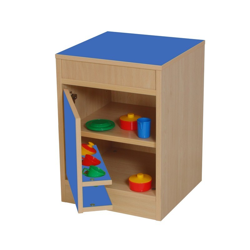Módulo de juego de imitación cocina (frigorífico). Fabricado en melamina de haya de 19 mm de grosor con cantos en PVC de 2 mm y DM melaminizado de 16 mm con cantos redondeados y barnizados con barniz no tóxico. Trasera de 10 mm. Acabados por las dos caras. Puerta interior de 16 mm de grosor con bisagras superacodadas y diseño de seguridad antiatrapamiento de dedos. Con ventana de metacrilato de gran resistencia. Encimera grabada simulando la placa y sus mandos táctiles. Mandos móviles de haya maciza.