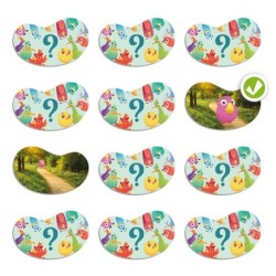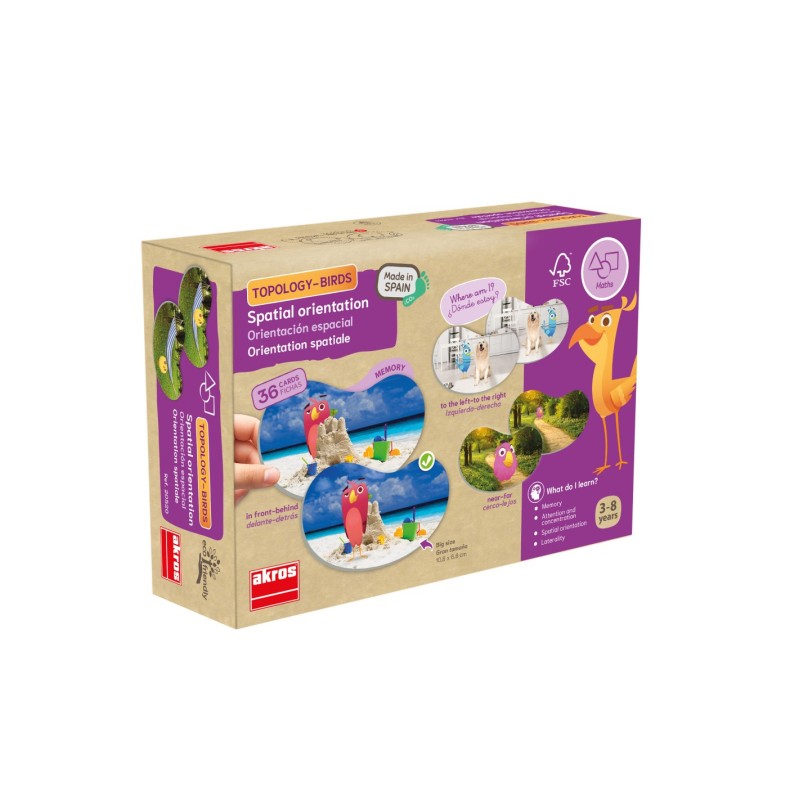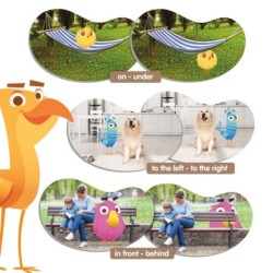 Original memory para desarrollar la orientación espacial y aprender posiciones espaciales opuestas: delante-detrás, dentro-fuera, encima-debajo, a la derecha-a la izquierda, cerca-lejos, y juntos-separados. ¡Forma parejas de divertidos pájaros en posiciones espaciales opuestas, y pon a prueba tu observación y memoria! Fichas de gran tamaño con escenarios reales.