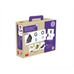 32 imágenes y 88 letras para formar las palabras representadas en cada imagen. Además permite formar muchas otras palabras. Adaptado para poder formar palabras en 11 idiomas diferentes.