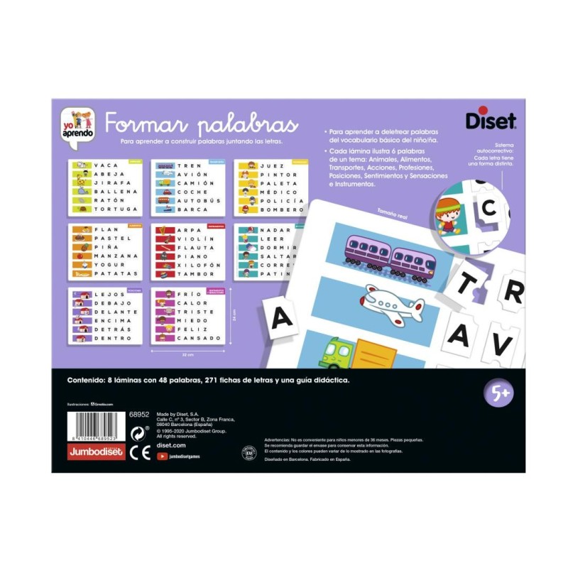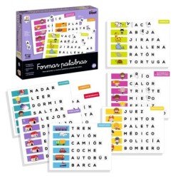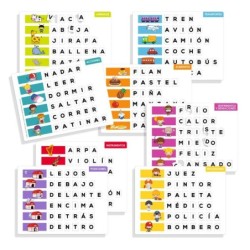 Juego educativo para aprender a formar 48 palabras de diferentes temáticas. El juego contiene 9 tableros y 258 fichas autocorrectivas.