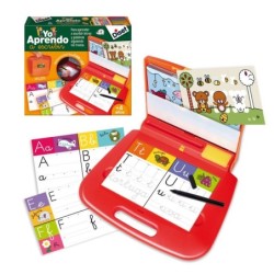 Este juguete educativo con el que tu niño aprenderá a escribir letras y palabras siguiendo los trazos forma parte de una completa y popular línea de maletines educativos con diferentes actividades escolares con las que tu niño aprenderá y practicará a leer, escribir, componer palabras, separarlas por sílabas, vocabulario en inglés, realizar sencillas operaciones… Un refuerzo escolar ideal para el aprendizaje del abecedario y la escritura a través de los diferentes trazos de las letras de niños a partir de 4 años, ¡Ahora con nuevo contenido, nuevas ilustraciones y nuevo diseño! Con Yo aprendo a escribir tu niño podrá practicar sus primeros trazos para aprender a escribir las primeras letras del abecedario en mayúsculas y minúsculas y algunas palabras de forma sencilla y divertida. Este juego consta de 21 láminas de dificultad progresiva que se pueden borrar y así tu hijo podrá practicar tantas veces como quiera. Además, le ayudará a desarrollar la capacidad de concentración, mejorar la coordinación ojo-mano y la motricidad fina. Sin darse cuenta aprenderá jugando y pasándolo en grande todo el abecedario!! Gracias a la base con luz que tiene el pupitre, que sirve como sistema autocorrectivo, el niño podrá comprobar si está realizando el trazo correcto. El pupitre-maletín convierte este juguete en un producto ideal para guardar las láminas en su propio compartimento, transportarlo y jugar sobre él.