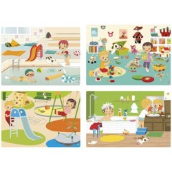Las 10 láminas de escenas magnéticas ilustradas proponen temas de la vida cotidiana: las prendas de vestir, la alimentación, el cuerpo y la higiene, los vehículos, los animales, los juguetes... Pueden seguir el desarrollo de una jornada: