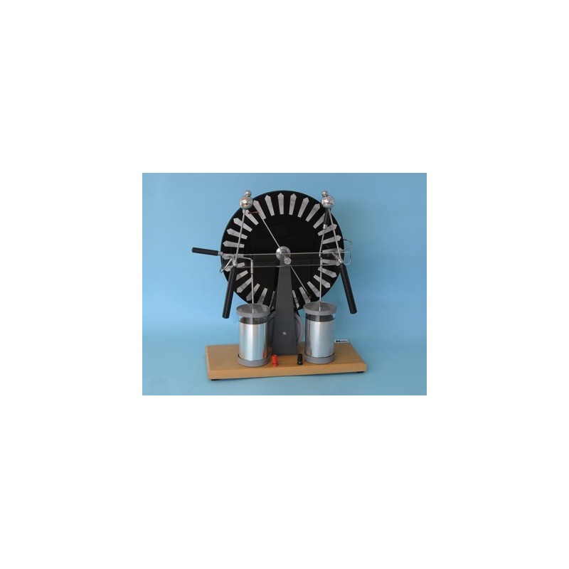 El dispositivo presenta también 2 barras cruzadas con “peines” colectores en los extremos y dos esferas de descarga montadas en el extremo de un par de brazos cuyo extremo opuesto presenta un mango aislante que permite regular la distancia entre ambas esferas.
