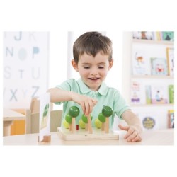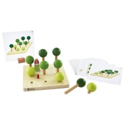 • 9 árboles de madera en 3 tamaños y 3 colores para plantar.