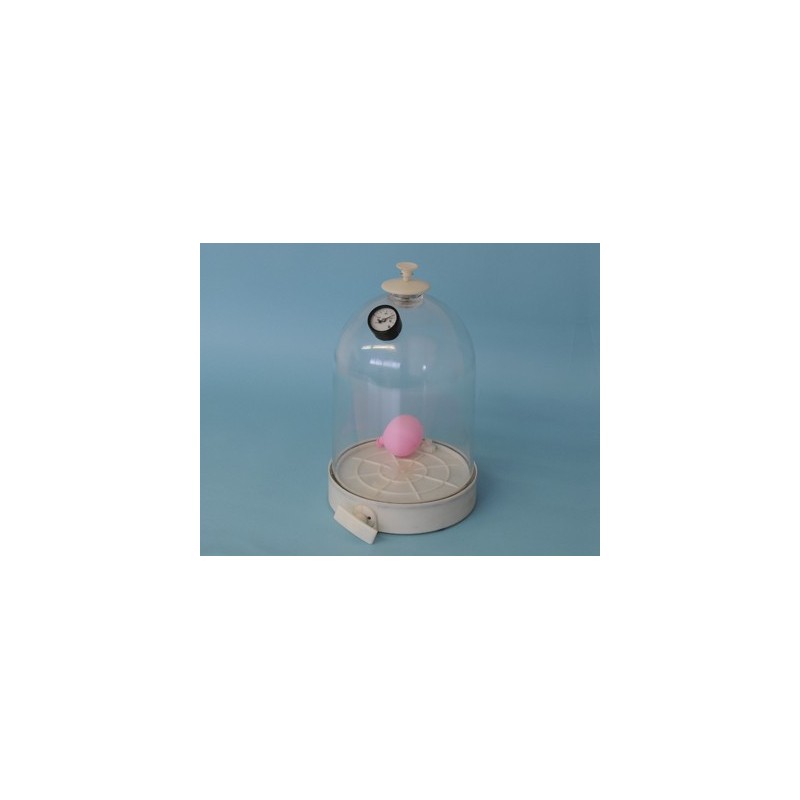 Aparato compuesto por una campana transparente y una bomba manual de vacío ambas fabricadas en resistente plástico ABS para la realización de experimentos de física del vacío.