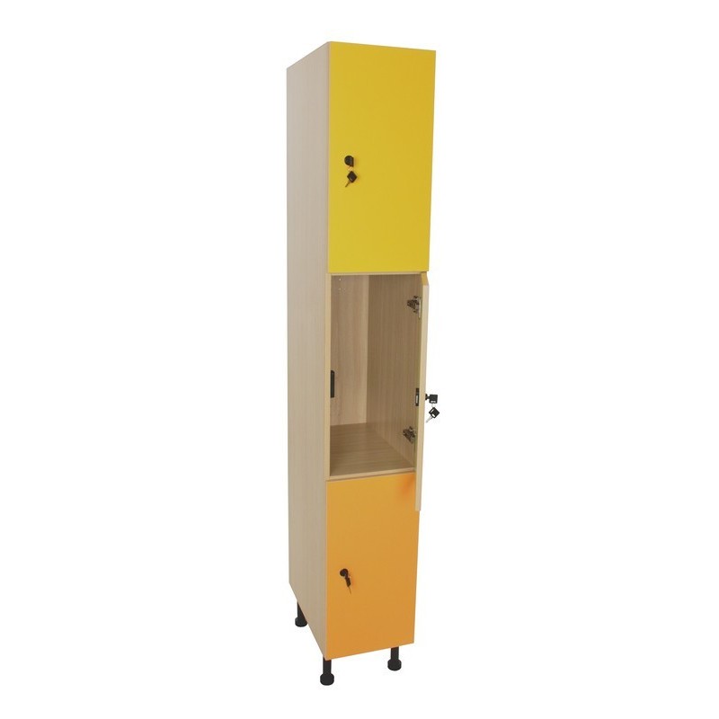 Taquilla de 3 puertas. Cada puerta dispone de cerradura amaestrada individualizada con 2 llaves dentadas y con revestimiento plástico,  incluidas. Interior con barra para colgar. Fabricada en melamina de haya, con tableros de 16 mm de espesor, excepto trasera de 10 mm, para darle mayor estabilidad, perforada para facilitar la circulación del aire en su interior; cantos de PVC de 2 mm, acabado por las dos caras. Patas niveladores de PVC de 15 cm, para evitar la humedad y desniveles que pueda tener el suelo.
