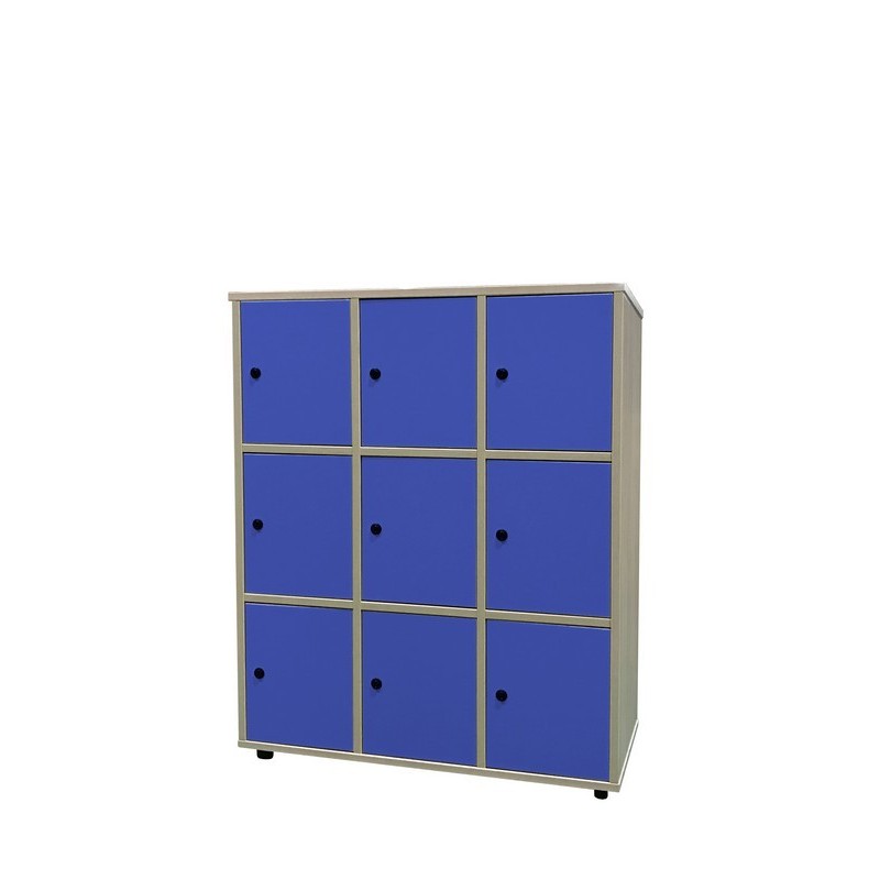Taquilla con 9 puertas y cerraduras desiguales amaestradas. Fabricado en melamina de haya de 19 mm de grosor, excepto trasera de 10 mm, puertas de 16 mm y cantos de PVC de 2 mm, acabado por las dos caras. Pies niveladores de PVC de 4 cm de diámetro y 4 cm de altura, para evitar la humedad y desniveles que pueda tener el suelo. Estos pies pueden ser retirados para poder superponer diferentes armarios. PUERTAS INTERIORES ANTIATRAPAMIENTO DE DEDOS EN SU CIERRE y tiradores de polímero suave (goma) (antigolpes).