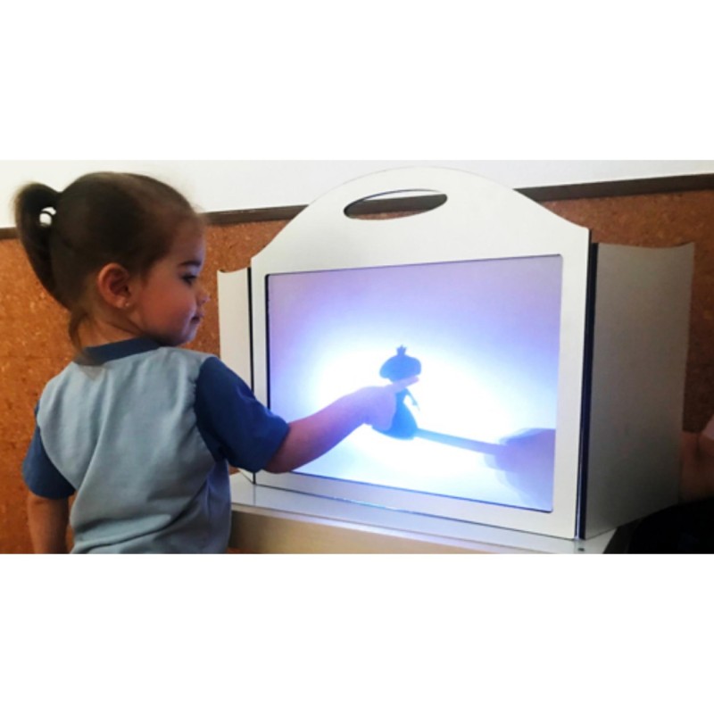 Un teatro de sobremesa robusto realizado en metacrilato blanco con laterales abatibles y pantalla traslúcida que puede ser utilizado con la mesa de luz o cualquier otra fuente de luz.