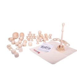 El conjunto incluye: 63 formas de madera suministradas con una bolsa de almacenamiento de cordón de algodón y el guía de actividades en 7 idiomas diferentes. Tamaño: Anillos de 4.8cm y 7cm de diámetro, cubos H 4cm, tazas para huevos H 6.3cm, bobinas H 3.5cm de diámetro, pelotas de 5cm de diámetro, cuencos de 7cm y 9.2cm de diámetro, soporte para anillos H 32cm. Edad: Apropiado a partir de los 10 meses.